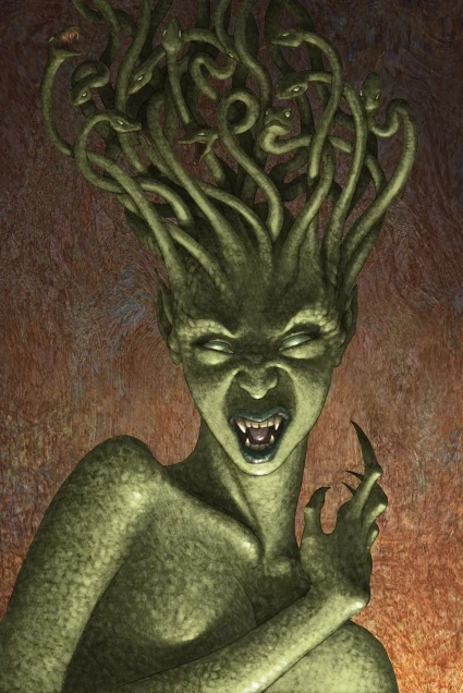Było to coś w rodzaju centaura, tyle że z kobiecym torsem. Zamiast ciała konia miała w dolnej części kształt smoka, długiego na co najmniej siedem metrów, czarnego i łuskowatego, z ogromnymi pazurami i kolczastym ogonem. Jej nogi były jakby oplątane winoroślą, ale nagle uświadomiłem sobie, że wyskakują z nich węże: setki żmij rozpełzających się dookoła, wypatrujących, co by tu ukąsić. We włosach tej kobiety również wiły się węże jak u Meduzy. Najdziwniejsze, że wokół talii, tam gdzie ludzka część spotykała się ze smoczą, jej skóra wydymała się i deformowała, od czasu do czasu układając się w pyski zwierząt: straszliwego wilka, niedźwiedzia, lwa – jakby miała pas złożony z wciąż przekształcających się stworzeń. Miałem wrażenie, że oglądam coś tylko częściowo ukształtowanego, potwora tak starego, że był tu od początku czasu, zanim kształty ostatecznie się ustaliły.—Opis Kampe; Bitwa w Labiryncie