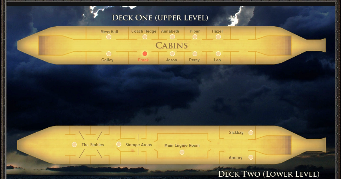 - Каюта Фрэнка — место отдыха и сна Фрэнка Чжана. Фрэнк присоединился к команде в спешке, так что у него не было шанса украсить свой собственный уголок. Стиль довольно строгий, что подобает ребенку Марса. Его каюта находится над машинным отделением, из-за чего весь дым от неудачных экспериментов Лео заполняет его каюту. У него есть свой лук и колчан на стене над его столом, и некоторые принадлежности для практики китайской каллиграфии.