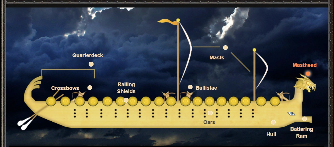 Две платформы, на носу и в корме, имеющие арбалеты для запуска швартами и крюками, с помощью которых можно захватить еще один военный корабль или, возможно, подобрать сорокофутовую статую.