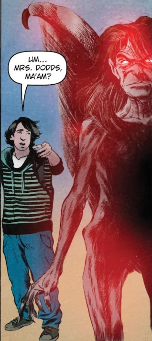 As Mrs. Dodds, Percy Jackson describes her as "little", she appeared as a "little", fifty-year-old woman always wearing a black leather jacket who looked mean enough to ride a Harley-Davidson into a student's locker. When she first transformed into Alecto, her eyes glowed like barbecue coals, her fingers turned into talons, and her jacket melted into large, leathery bat wings. She also had a mouth full of yellow fangs, with that along with her wings and claws she didn't look human anymore.