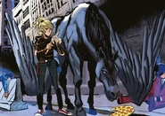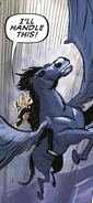 When Percy, Piper McLean, and Jason Grace are standing on a deserted highway trying to get to a mile marker called Topeka 32, Jason claims that he has a friend that could help them out. Percy claims the same thing and they both call their horses at the same time. Blackjack soon flies from out of the sky and Piper said that she had never seen a pegasus like that one before. When he lands, he asked Percy if he could have any donuts, to which Percy says they can later. When Jason's horse Tempest arrives moments later, it makes Blackjack a little nervous, but Percy calms him down.