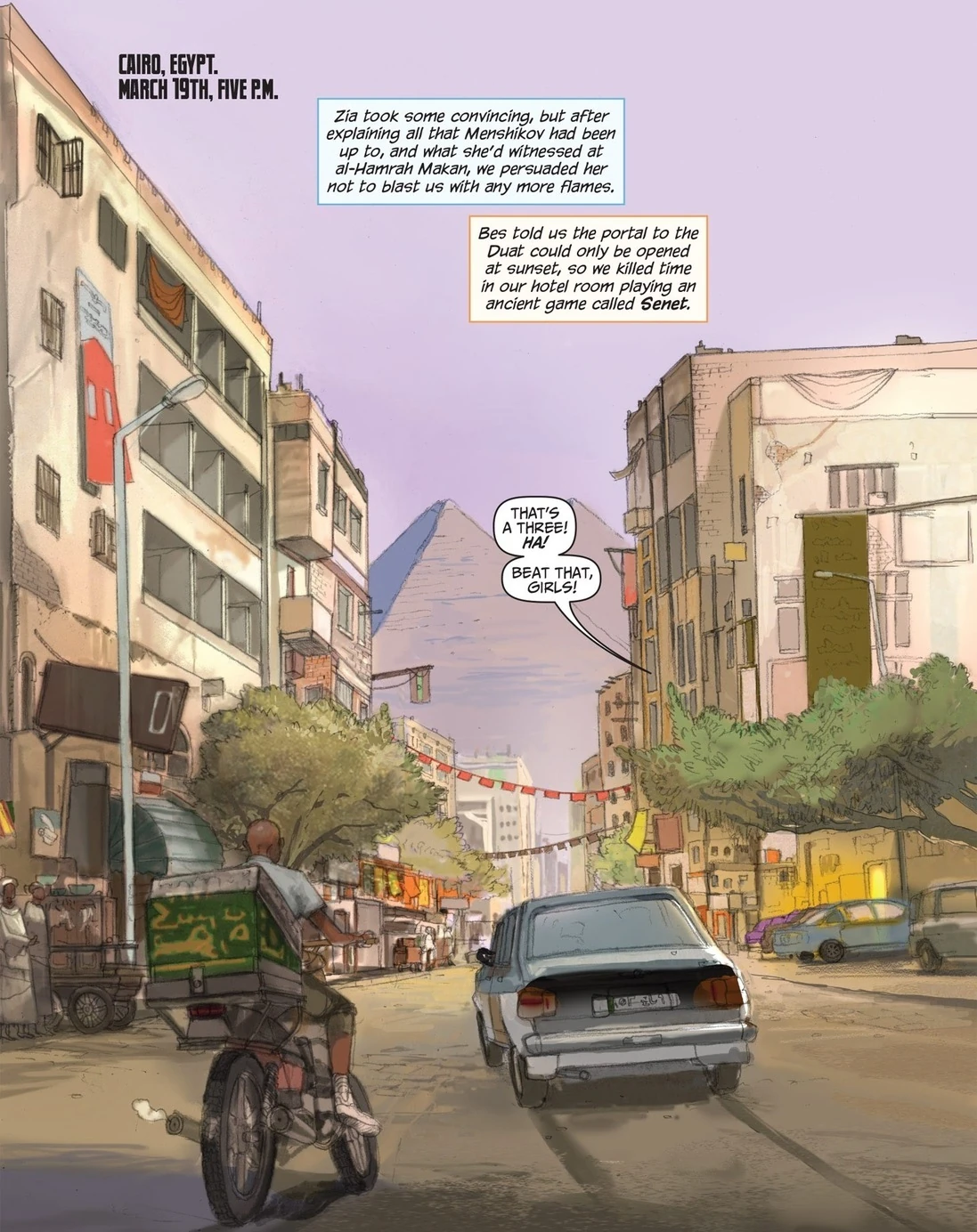 Carter Kane, Sadie Kane, and Zia Rashid teleport through a portal to the Cairo airport and then head to The First Nome.