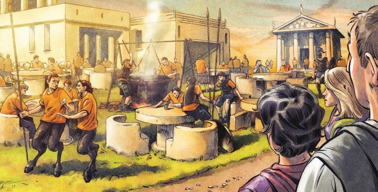 The Dining Pavilion is an area of Camp Half-Blood where the demigods, satyrs and camp directors eat their meals.