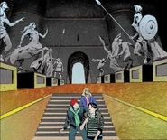 Entry Hall: In the film adaptation, Percy, Annabeth, and Grover walk through an entry hall when they enter Hades' Palace. It has stone walls and floors, a brass flaming fountain, large, wooden double doors with torches on either side, and two stone stairway entrances on either side with a red carpet in the middle.