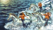 Tyson seems to get along with the hippocampi. Later, hippocampi appear when Poseidon arrives to battle Typhon. They pull Poseidon's chariot out of the river and can swim through the air as easily as they can in water.